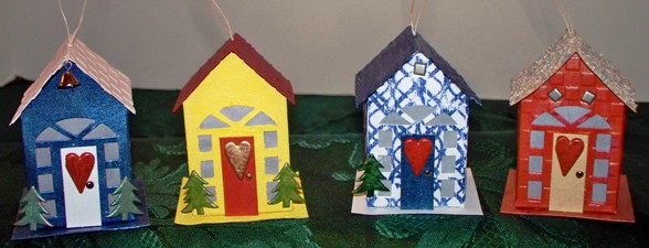 I had a set of die cut house ornaments to assemble, so I decided to work on them using the color challenge. I realize that my rust actually photographed more red, but it is really a rust color and the roof on the blue house looks rather pink even though it is white. I used my Creative Inspirations paints to color all of the houses and roofs (except the mustard house and the rust house's roof.) In addition to the color, I played around a bit with texture. The mustard house was painted with crackle paint and has an adobe-like finish to it. The rust and blue were embossed with different embossing folders. The roof of rust house is covered with a sand mixture giving it a very rough texture. The white house was stamped using blue ink. Each of the houses has a loop to hang them on the tree and on the back is a hole which can be used to put a Christmas light in to light them up. It was a fun project to work on.